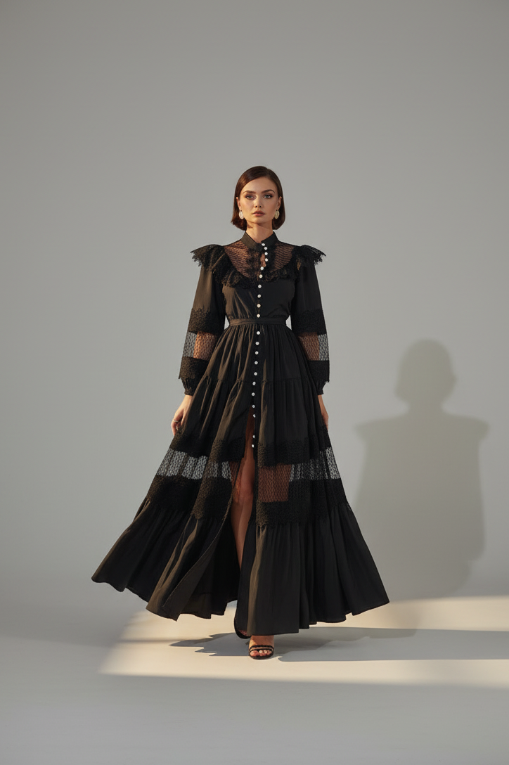 The Jasmine Dress is a luxurious and romantic black maxi gown, designed for an elegant and sophisticated look.