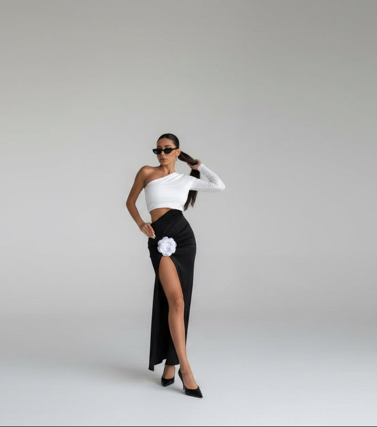The Monochrome Rose is more than just an evening dress; it’s a conversation piece.